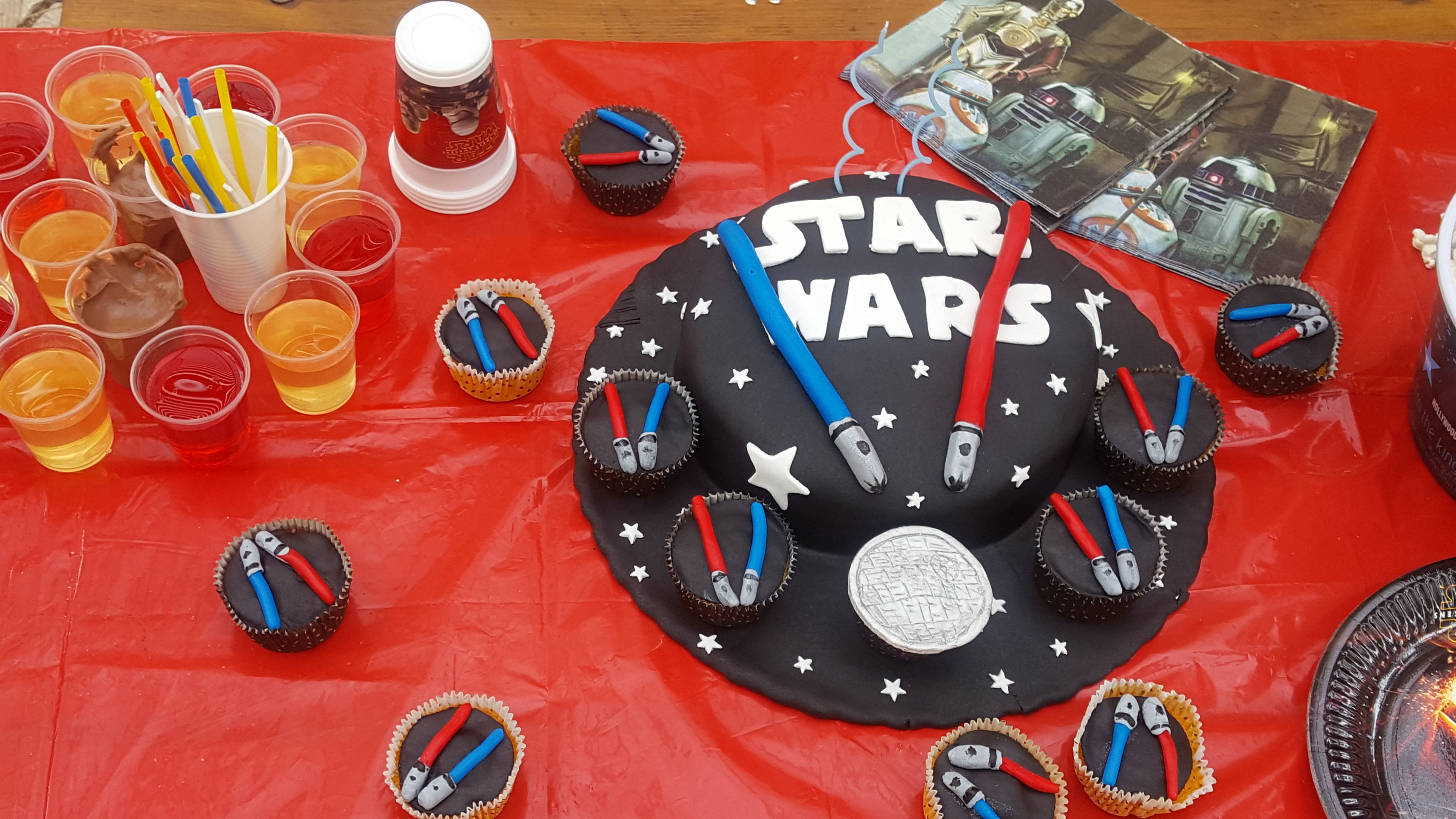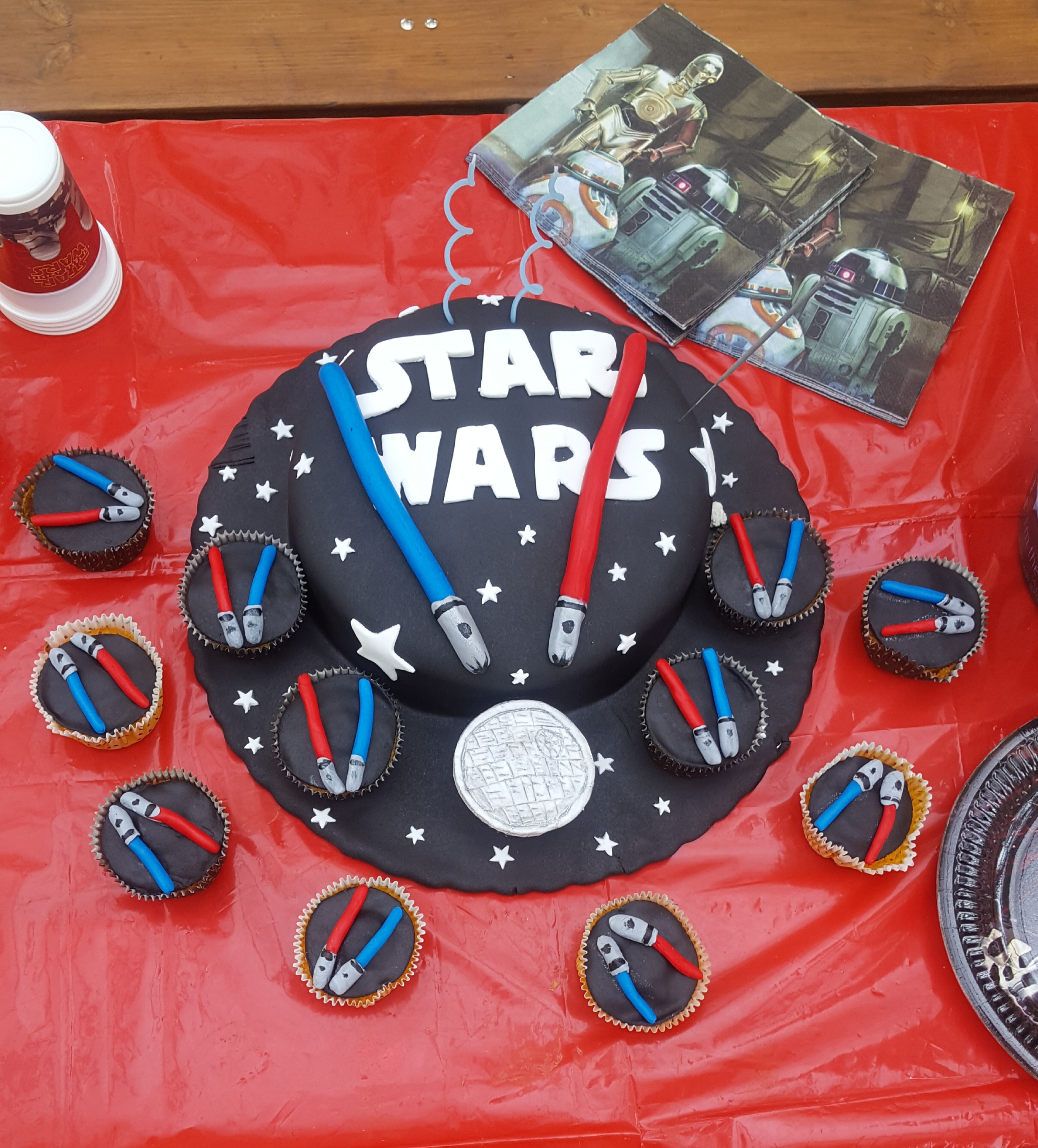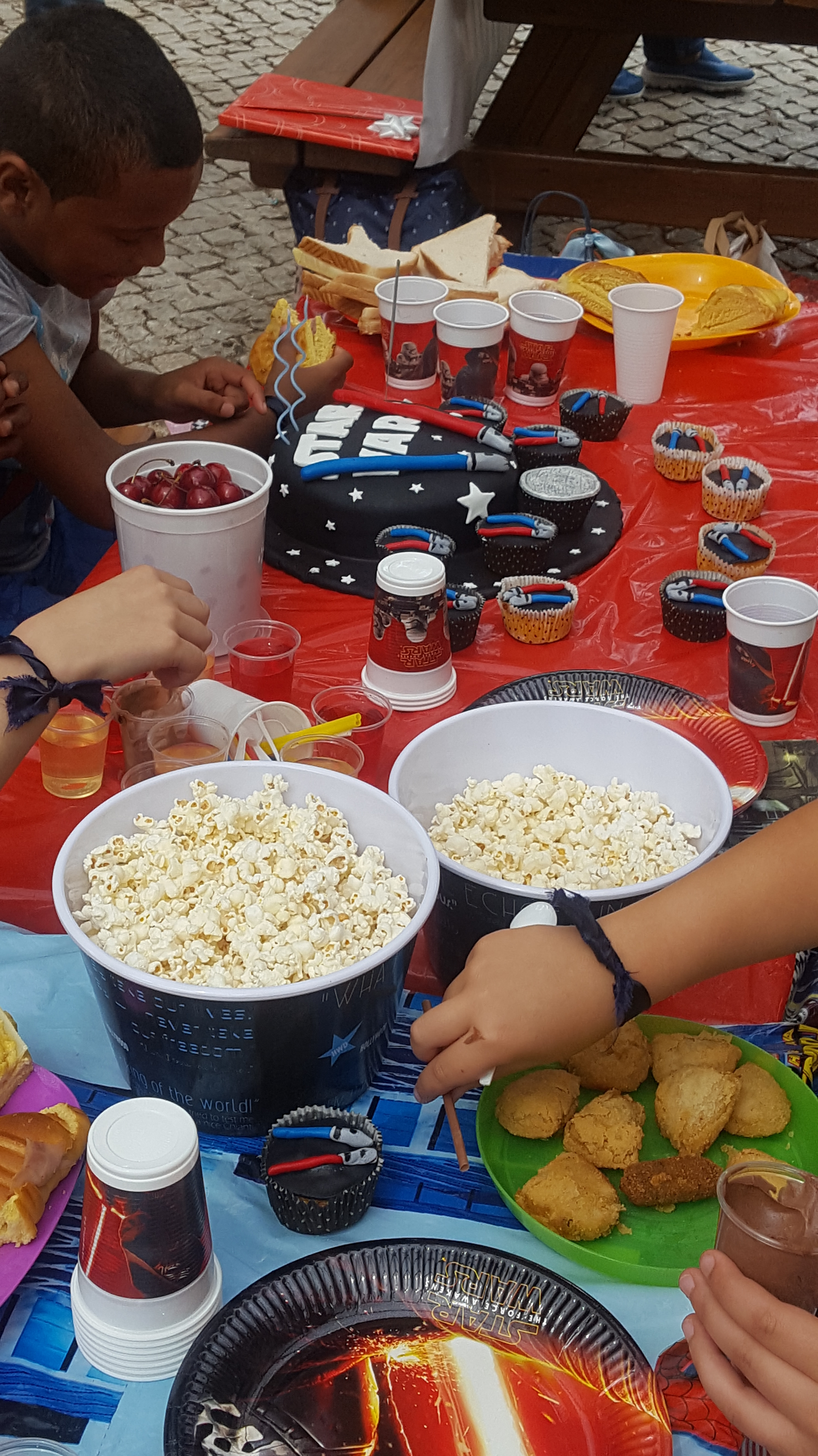 Para além disso, uma das meninas é igualmente uma exímia cake designer, fez e trouxe o bolo diretamente para a festa o que me poupou imenso tempo. O bolo foi escolhido pelo N. que andou a googlar que tipo de bolo queria e, como não podia deixar de ser foi dedicado a um dos seus temas preferidos: Star Wars.