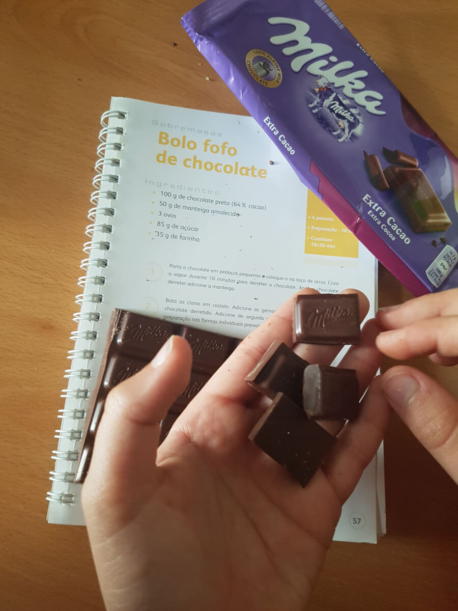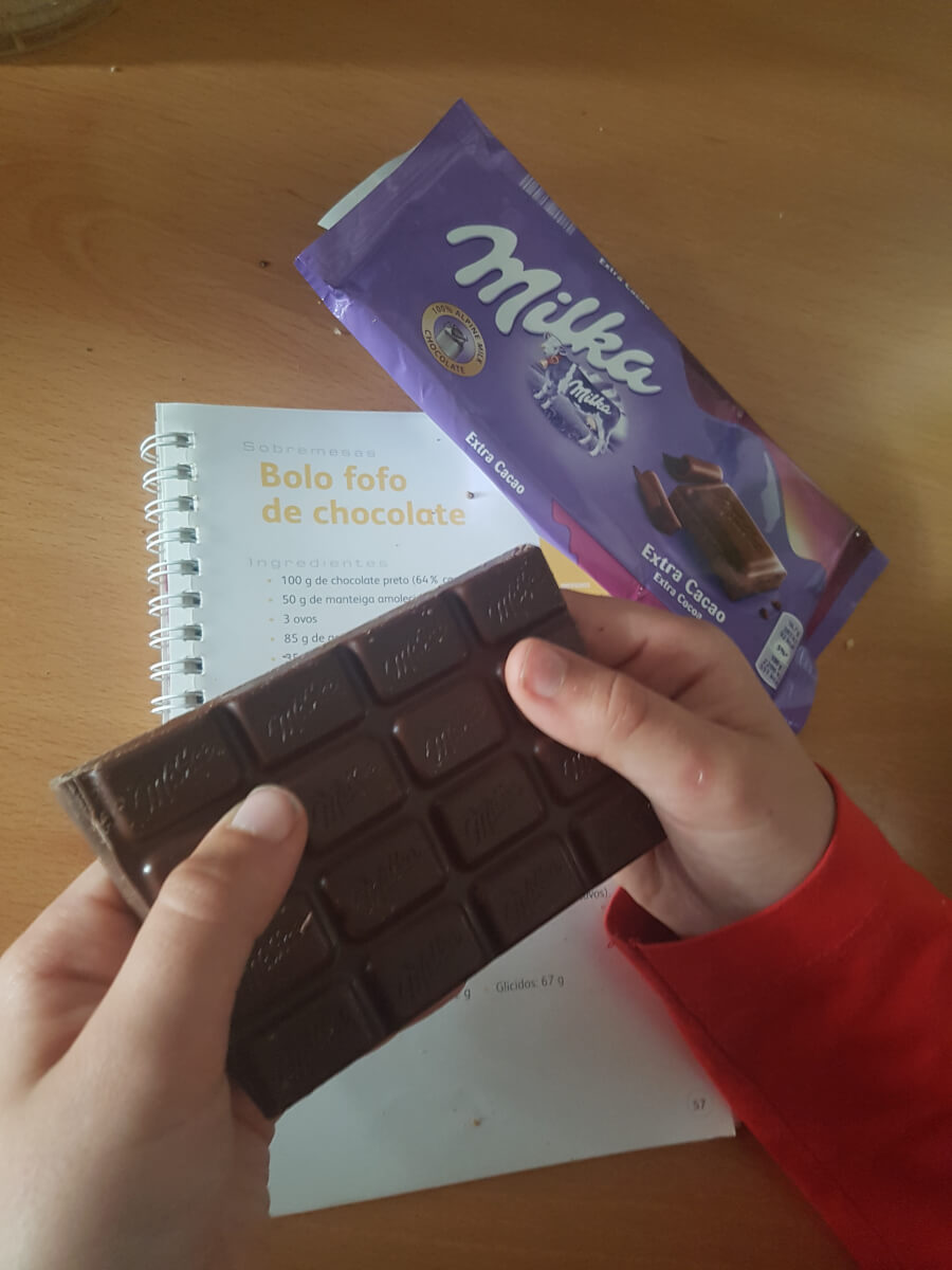 NOTA: como só tínhamos em casa uma tablete de chocolate da Milka, acabámos por usá-la e cortámos no açucar para 45 gr (ficou igualmente delicioso)