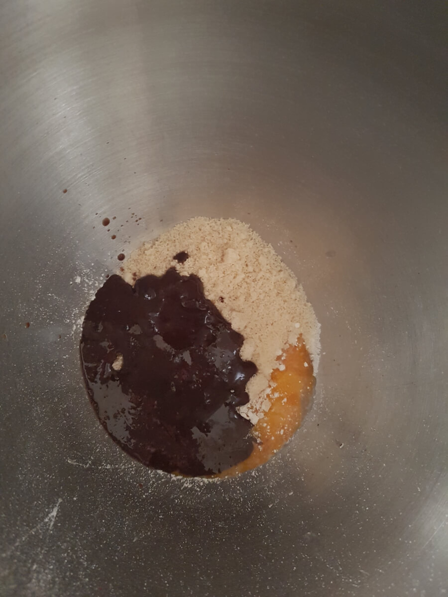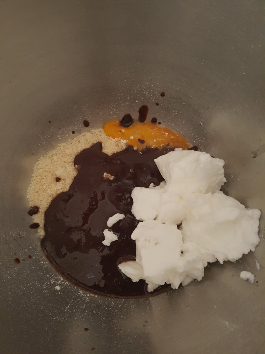 - Junte ao chocolate derretido as gemas, açúcar, farinha e as claras.