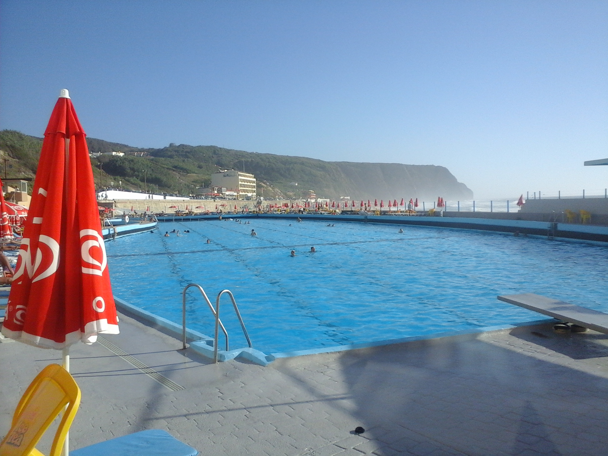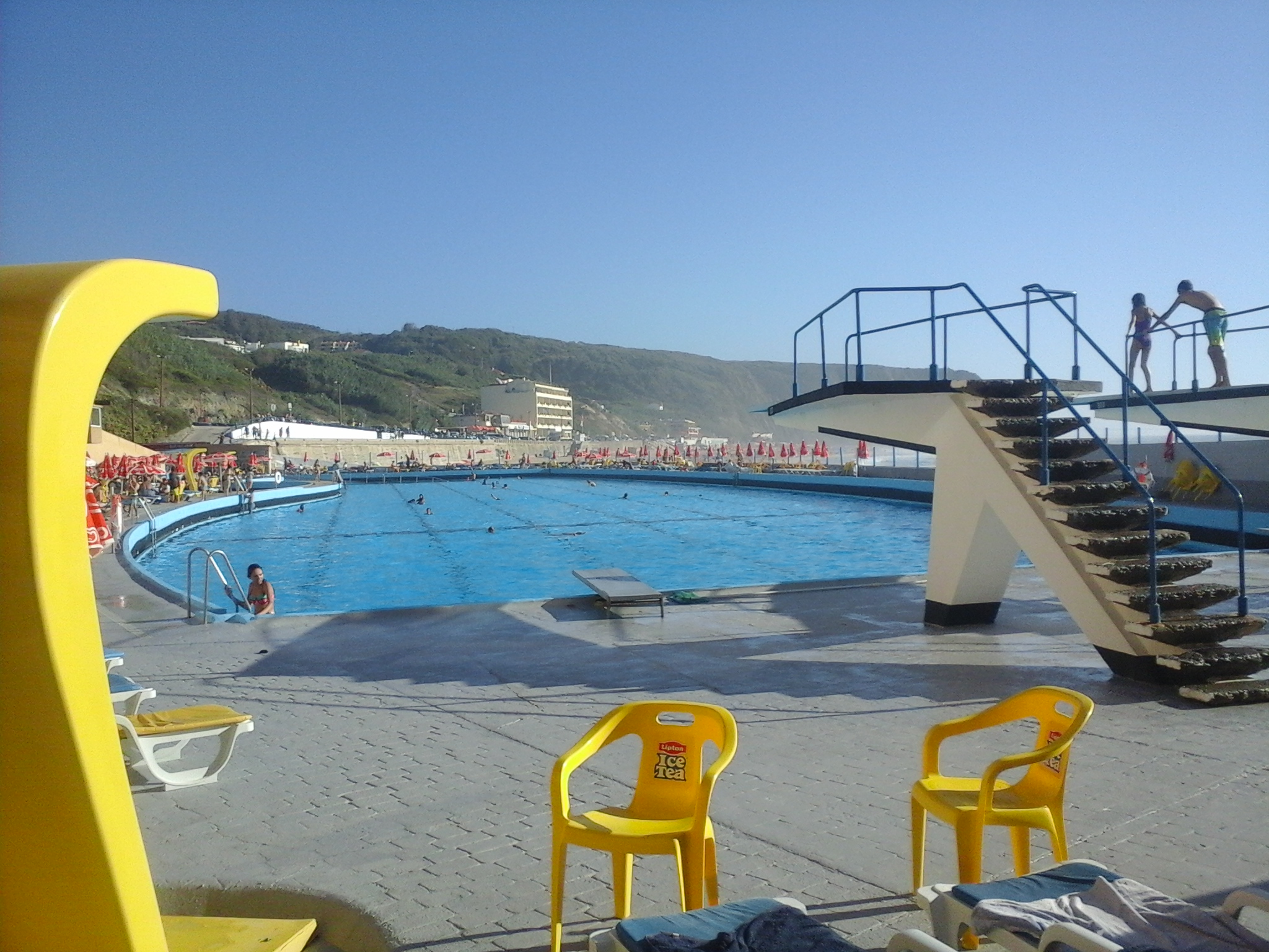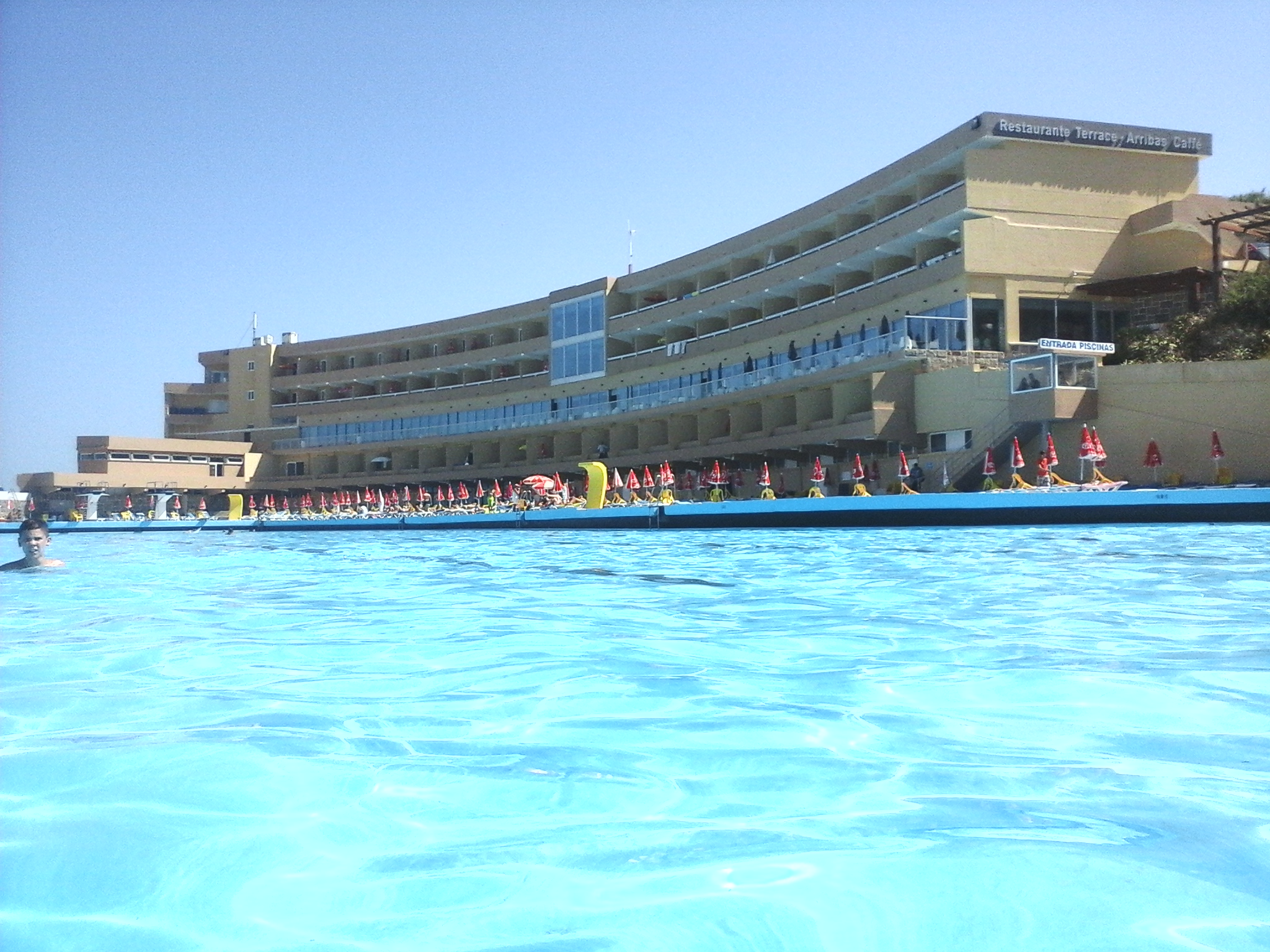 É enorme (100 metros) e muito limpinha, sendo fácil que se possa estar um dia inteiro sem se sentir espezinhado. Tem uma piscina mais pequenina e maneirinha para as crianças mas a própria piscina grande tem um patamar inicial bastante baixinho. Para os mais afoitos, têm também duas pranchas para poderem mostrar as vossas proezas! Também tem salva-vidas, just in case!
