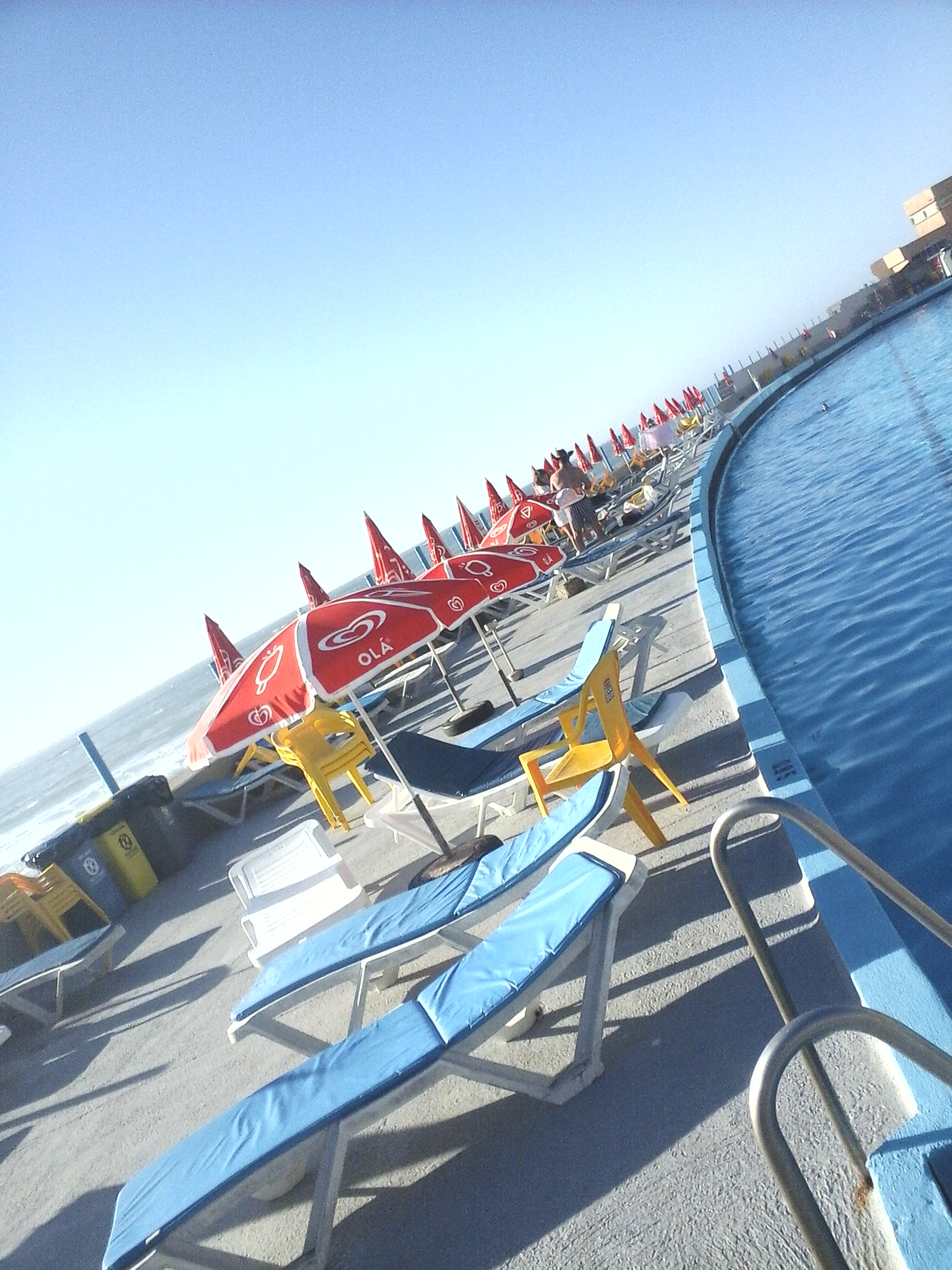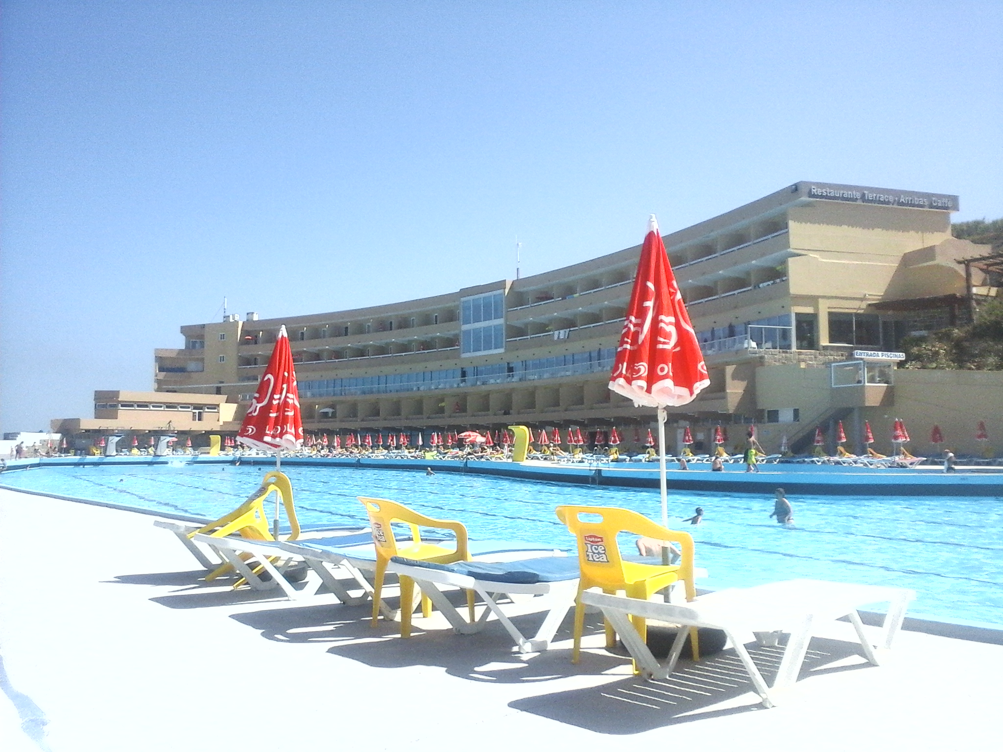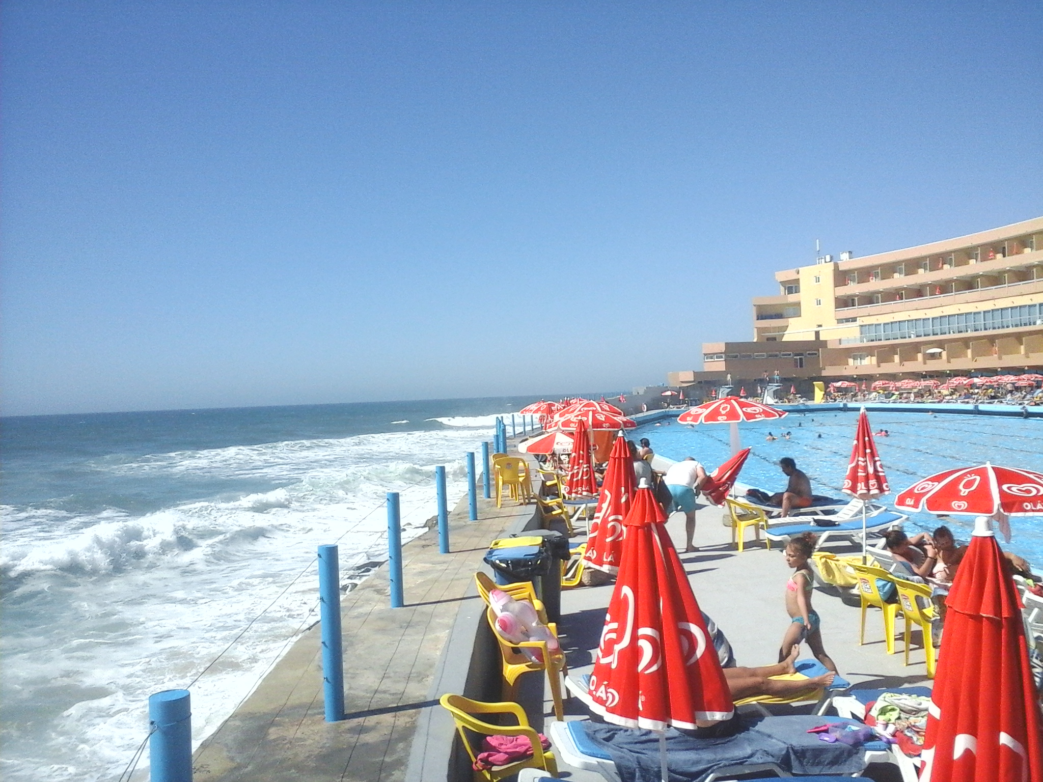É enorme (100 metros) e muito limpinha, sendo fácil que se possa estar um dia inteiro sem se sentir espezinhado. Tem uma piscina mais pequenina e maneirinha para as crianças mas a própria piscina grande tem um patamar inicial bastante baixinho. Para os mais afoitos, têm também duas pranchas para poderem mostrar as vossas proezas! Também tem salva-vidas, just in case!